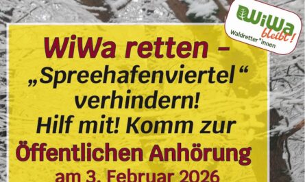 in drei Tagen ist es so weit: Am 3. Februar kommt bei einer öffentlichen Anhörung im Bezirksamt erneut die Frage auf den Tisch, ob einer der letzten echten Wälder mitten in unserer Stadt für ein Neubaugebiet geopfert werden soll.