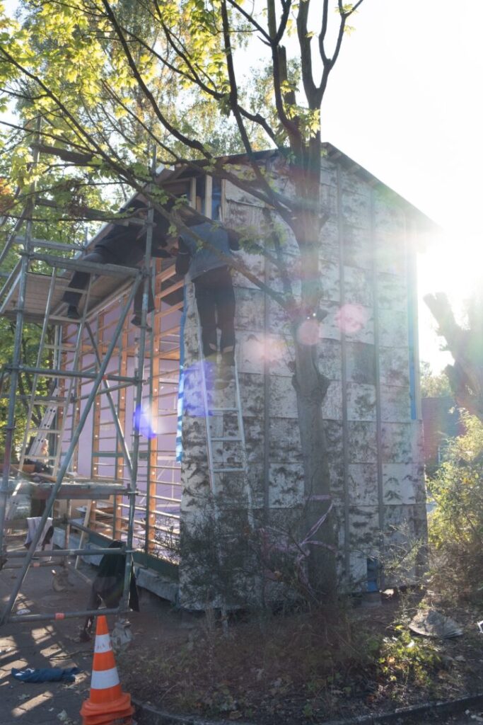 Martha Starke, eine der „Pilzköpfe“ von MYCO+, und Professor Karsten Schlesier von der HafenCity Universität (HCU) erklärten den Besucher*innen die Vorteile von nachwachsenden Baustoffen aus Myzel bei einer Führung im Labor. Karsten Schlesier hob besonders die Vorteile der Forschungen in den Zinnwerken hervor. Hier seien keine langen Anträge erforderlich. Es entstünde eine Idee und dann würde gemacht. Wie bei allen Projekten in den Zinnwerken üblich, wird möglichst recycelt. Jetzt wurde ein alter Getreidetrockner (WIR 16.4.25) nach Wilhelmsburg geholt und wieder aufgebaut. Die alten Holzbalken wurden geschliffen und geölt, die tragenden Teile restauriert. Die durchsichtige Frontwand ist aus recyceltem Granulat gefertigt. Am Giebel und an den Ecken des Labors wurde dekorative Birkenrinde verarbeitet.