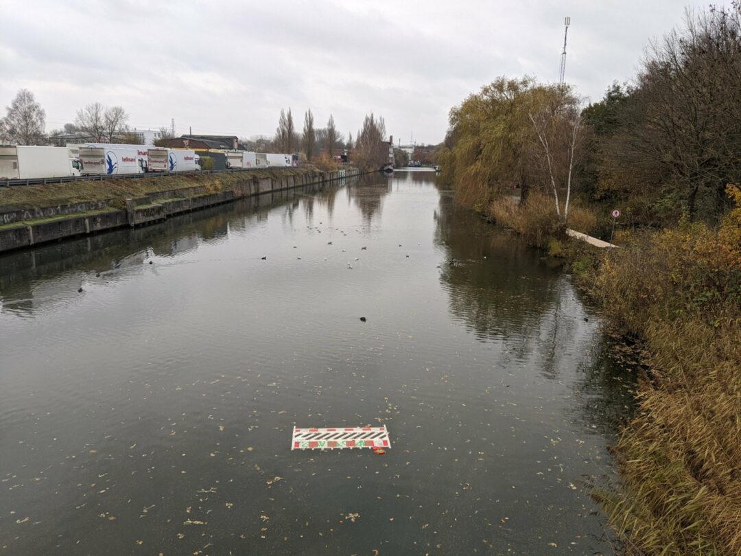 Zwei Tage später hat es wohl jemand nicht mehr abwarten können, den kleinen Steg wieder benutzen zu können. Die Absperrung schwimmt im Veringkanal.