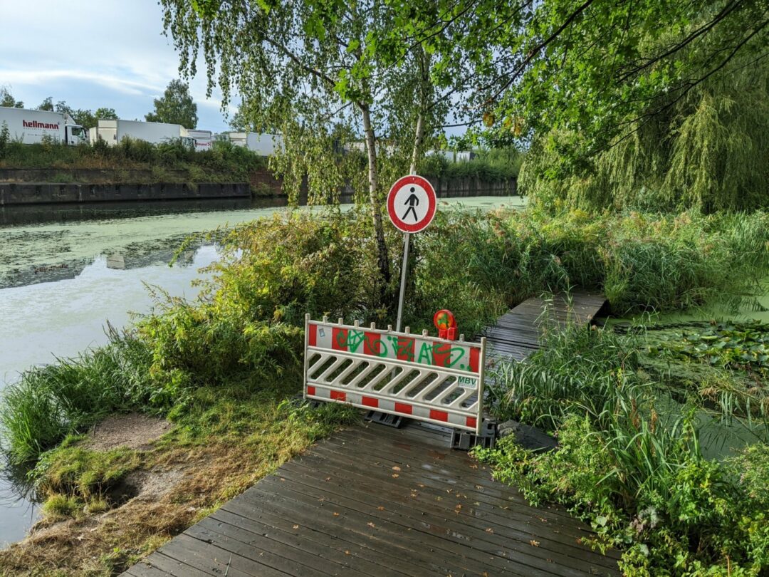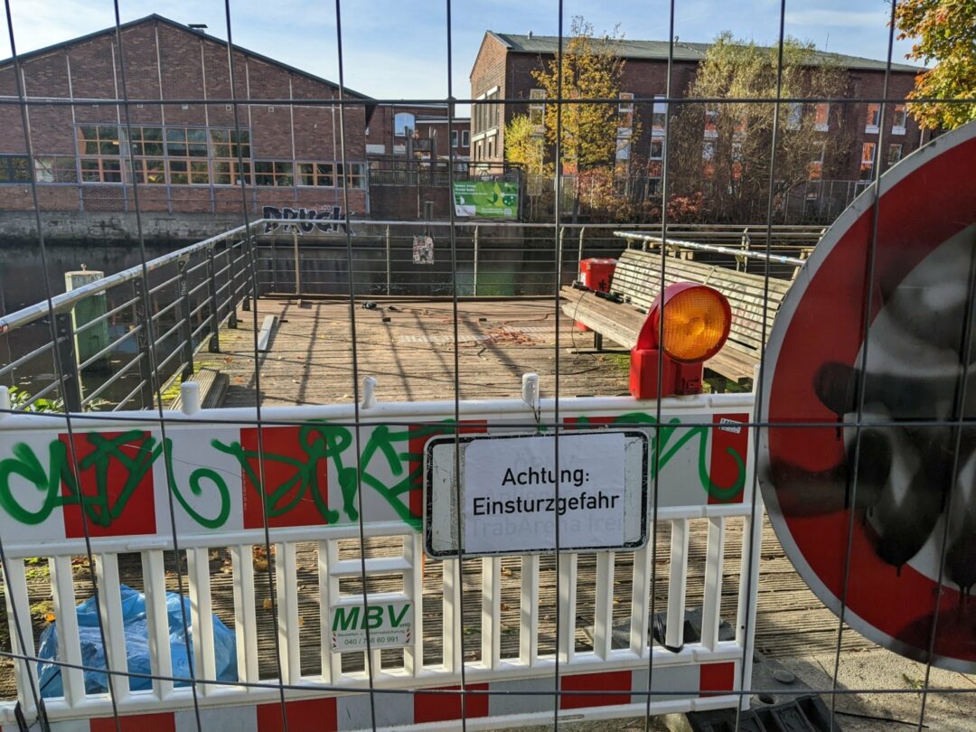 Man sollte meinen, es wäre recht einfach: Eine E-mail an den Bezirk Mitte (BA) und ich könnte unseren Leser:innen mitteilen, wann die Stege wieder eröffnet werden können und warum sie baufällig sind. Anfangs sah es auch ganz danach aus: Die Pressestelle des Amts antwortete mir, für den ersten Steg vom Sanitaspark zum Veringhof 23 sei der Landesbetrieb Straßen, Brücken, Gewässer (LSBG) zuständig, für den kleineren Steg am Veringkanal oberhalb der Neuhöfer Straße das Bezirksamt.