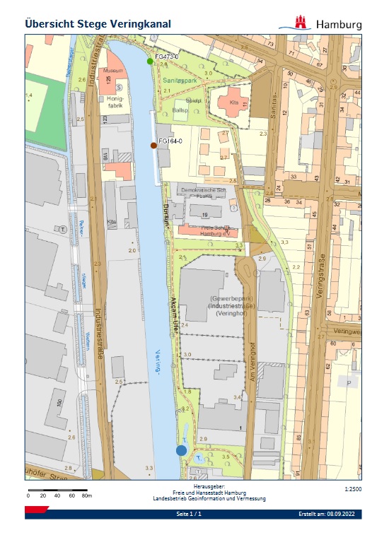 Die LSBG verneinte ihre Zuständigkeit und verwies mich zunächst an die Hamburg Port Authority (HPA), dann an die „Wassergenossenschaft der Anlieger des Veringkanals“, diese wusste allerdings nicht einmal, dass die Stege gesperrt worden sind. Zudem sind sie nach Aussage ihres Vorstandes lediglich für die Instandhaltung des Wasserweges zuständig, ansonsten seien es die jeweiligen Besitzer der direkt anliegenden Grundstücke. Also hakte ich wieder im Bezirk und bei der LSBG nach. Das Ergebnis: Der Steg am Sanitaspark wurde von der LSBG im März diesen Jahres vom Bezirk übernommen.