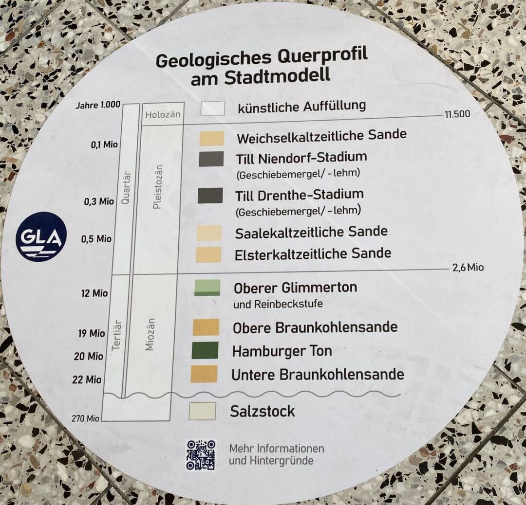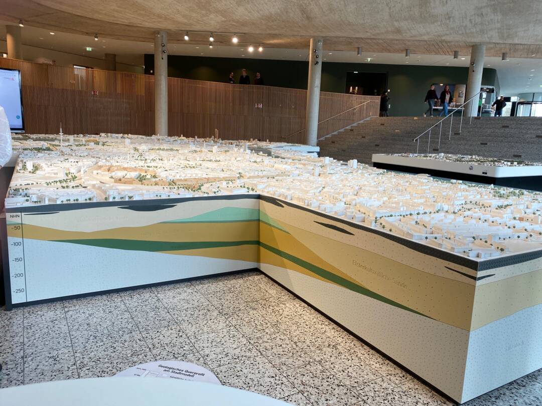 In der Behörde ist zu sehen, welche Gesteinsschichten sich genau an dieser Stelle im Untergrund befinden. Sascha Tegtmeyer, stellvertretender Geschäftsführer des Landesbetriebes Geoinformation und Vermessung (LGV) erklärte, dass das Modell in der hauseigenen Modellbauwerkstatt entstanden sei: „Von der ersten Sichtung der Daten über die Aufbereitung bis hin zur Umsetzung mit modernster Frästechnik haben wir das geologische Untergrundprofil so aufbereitet, dass es sich nahtlos in das bestehende Stadtmodell einfügt – verständlich, anschaulich und genau auf die Anforderungen des Geologischen Landesamtes abgestimmt.“
