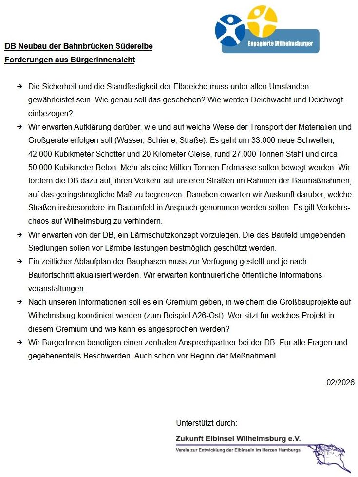 Zuletzt wies Dirk Holm von den Engagierten Wilhelmsburgern auf die jahrzehntelangen Belastungen hin, die auf die Wilhelmsburger*innen durch den Bau der Bahnbrücken Süderelbe zukommen würden. Es solle ein Forderungskatalog an die Bahn gesandt werden, welcher schon vom Verein Zukunft Elbinsel Wilhelmsburg unterstützt werde.
