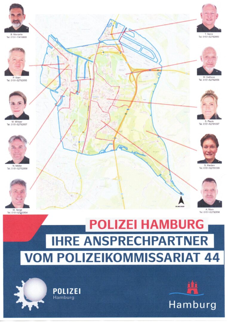 Christine Höxtermann (41), neue Revierleiterin des Polizeikommissariats 44 (Wilhelmsburg), ist Mutter von zwei Kindern (12 und 15 Jahre alt). Zu Veranstaltungen kommt die in Schleswig-Holstein Wohnende meistens in Begleitung eines*r Bürgernahen Beamten*in. Christine Höxtermann freut sich darauf, die Bürger*innen auf Wilhelmsburg kennenzulernen und ist offen für Austausch. Bisher hatte sie schon Kontakt zu Jugendlichen aus dem Stadtteil. Themen gibt es viele: zum Beispiel Verkehrskontrollen in Georgswerder, Treffpunkte für Jugendliche, abgemeldete Fahrzeuge und Drogen/Alkoholkonsum im öffentlichen Raum. Übrigens: Für kaputte Straßen ist der Landesbetrieb Straßen, Brücken und Gewässer Hamburg (LSBG) zuständig. Aber die Polizei kann die Beschwerden auch annehmen und weiterleiten. Ginge es nach der Revierleiterin, so würde sie gern viele Jahre im Stadtteil bleiben.