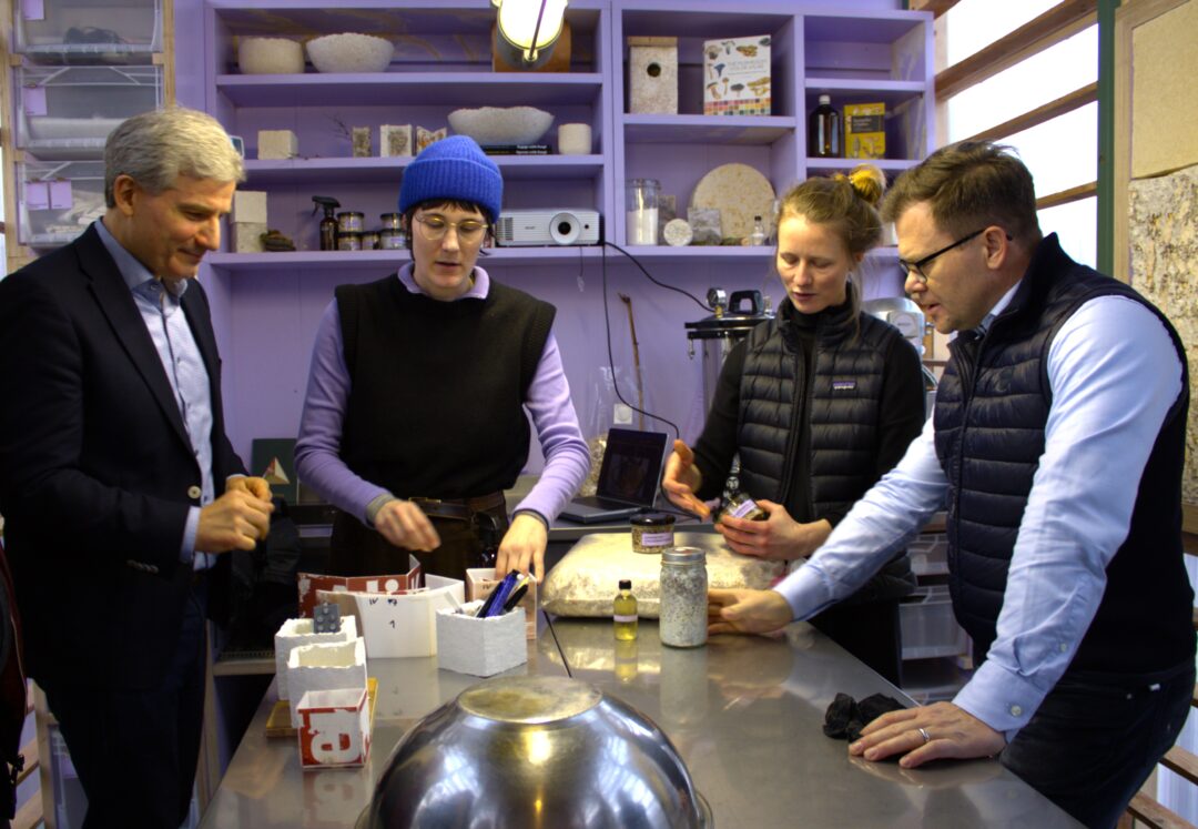 Der Umweltminister durfte auch selbst Hand anlegen und Myzel selbst zu einem Stifthalter formen, um auch haptisch das Baumaterial zu erleben. Dabei wird ein organisches Substrat, wie Holzspäne, mit Myzel gemischt und ist nach drei Stunden Trockenzeit fertig. Beim Termin begleitete ihn auch Bundestagsabgeordneter Metin Hakverdi (SPD) aus Wilhelmsburg. Der Bundesumweltminister meinte zum Abschluss: „Ich fühle mich hier sehr wohl. Vielen Dank, dass ihr euch die Zeit genommen habt, und ich etwas gelernt habe.“