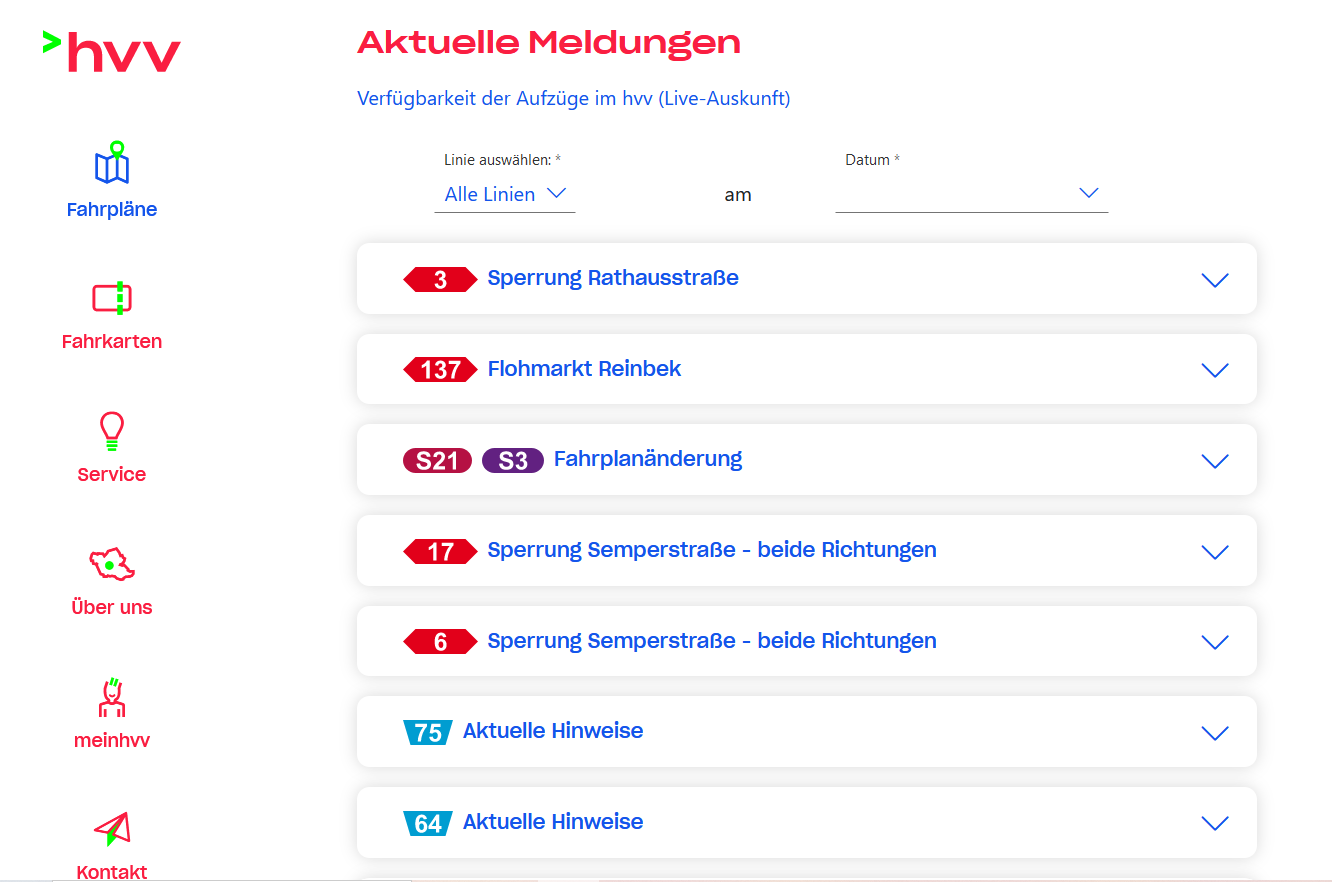 Die gute Nachricht: Seit Kurzem hat der HVV sein Informationsangebot erweitert. Auf seiner Homepage sind unter „Fahrpläne“ > „Aktuelle Meldungen“ nun Störungen zu finden, auch die der Fährlinien. In der mobilen App geht das bei den drei Strichen unten links, dem sogenannten Burgermenü. Dann auf „Meldungen“ klicken und dann „Alle“. Wer auf der HADAG-Seite ganz nach unten scrollt und auf „Störungen“ klickt, gelangt zur selben Seite.