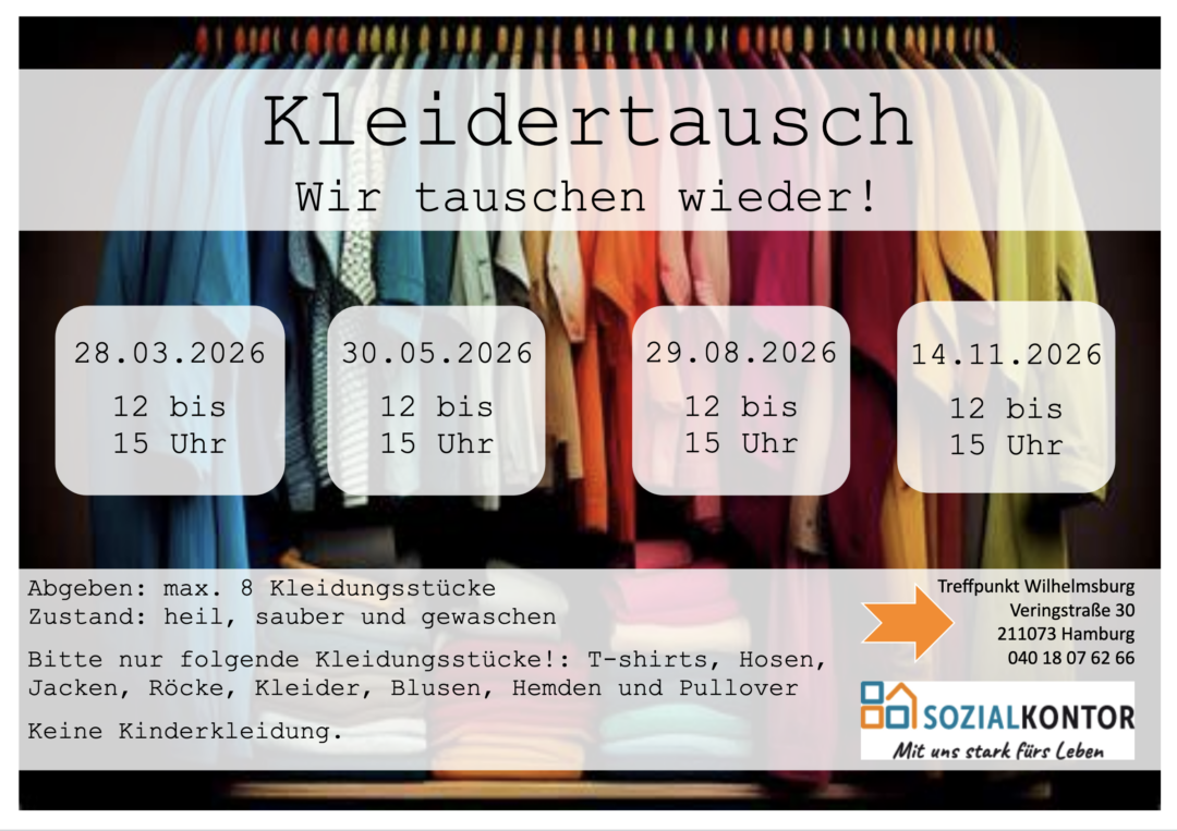 Kleidertausch Wann Sa., 14. Nov. 2026 12:00 - 15:00 Zum Kalender hinzufügen ICS herunterladen Google Kalender iCalendar Office 365 Outlook Live Wo Treffpunkt Wilhelmsburg – Sozialkontor Veringstraße 30, Hamburg, 21107 Veranstaltungstyp Einmaliger Termin Erwachsene Geselligkeit Tauschmarkt kleidertausch Geben: maximal acht Kleidungsstücke Zustand: heil, sauber und gewaschen Bitte nur folgende Kleidungsstücke!: T-Shirts, Hosen, Jacken, Röcke, Kleider, Blusen, Hemden und Pullover Keine Kinderkleidung Beitragsbild von Ulrike Mai auf Pixabay
