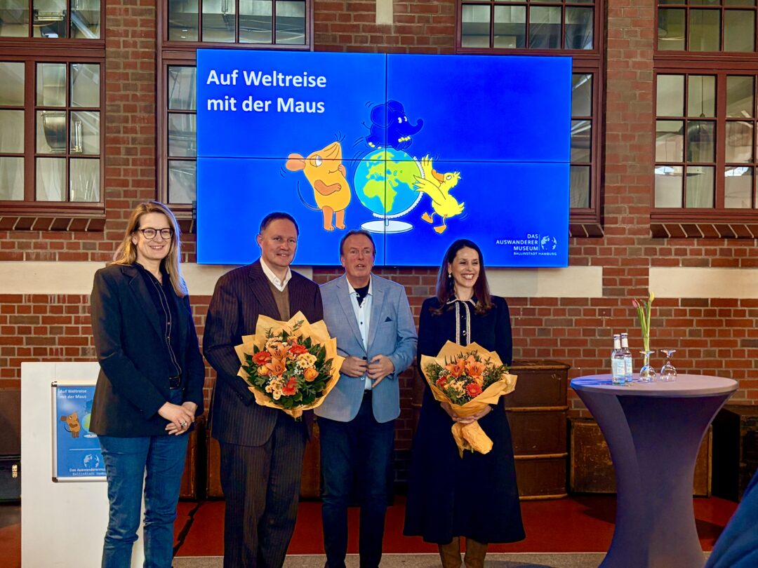Zum 55. Geburtstag der „Sendung mit der Maus“ lädt das BallinStadt-Museum in Zusammenarbeit mit dem WDR zur Sonderausstellung ein. Kultursenator Carsten Brosda als Schirmherr, Dorit Otto von der „Dorit und Alexander Otto Stiftung“, und der Geschäftsführer des Museums, Volker Reimers, eröffneten am Montag die Ausstellung „Auf Weltreise mit der Maus“. Carsten Brosda sprach dabei von den Fragen, die sich Kinder stellen und ermutigte den Nachwuchs neugierig zu sein, um die Welt aktiv zu entdecken. Volker Reimers erzählte von der Herausforderung, das richtige Konzept für die Ausstellung zu finden, da es bei der Sendung keine Requisiten, Puppen oder Filmsets gibt.
