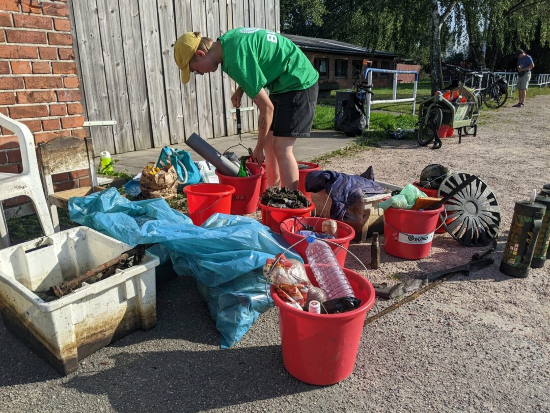 Bei bestem Sommerwetter und neugierig beäugt von mindestens drei Nutria-Familien, jeder Menge Reiher, Enten und Gänse fischten die Paddler*innen drei Stunden lang alles aus dem Wasser, was nicht dort hingehört. Am Ende waren es knapp 70 kg Plastiktüten und -kisten, Metallschrott, Flaschen, Kleidung, Feuerzeuge, Stühle und ein Kinderwagen.
