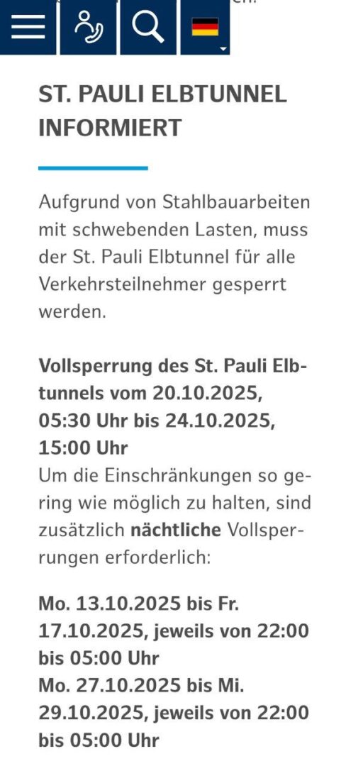 Sperrung des St. Pauli Elbtunnels vom 20.10. bis 24.10.2025