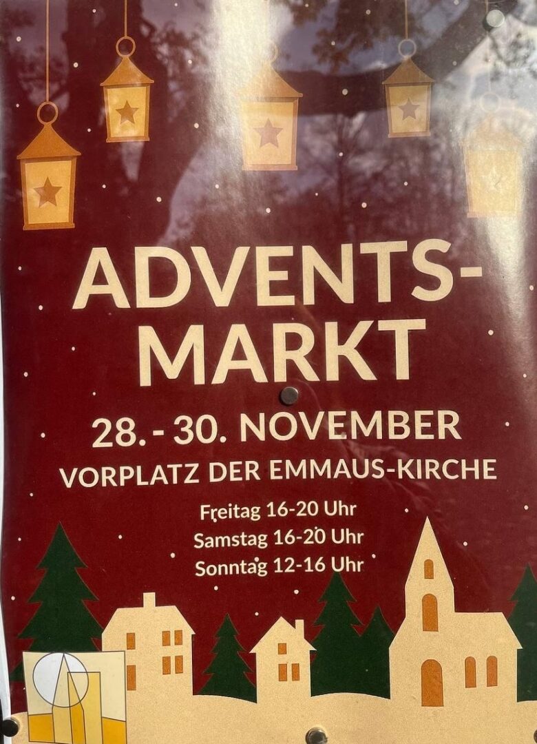 Wir feiern den Advent! Der erste Adventsmarkt auf dem Vorplatz der Emmaus-Kirche findet rund um den 1. Advent statt.