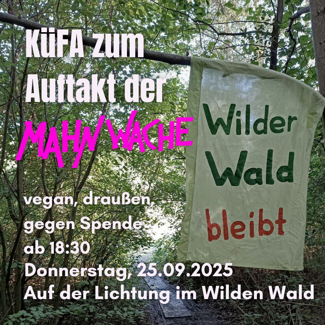 Am Donnerstag Abend geht es los! 🔥 Unsere reguläre KüFA im Infoladen fällt aus, dafür sind wir mit leckerem Essen auf der Lichtung im #WilderWald zu finden 💚