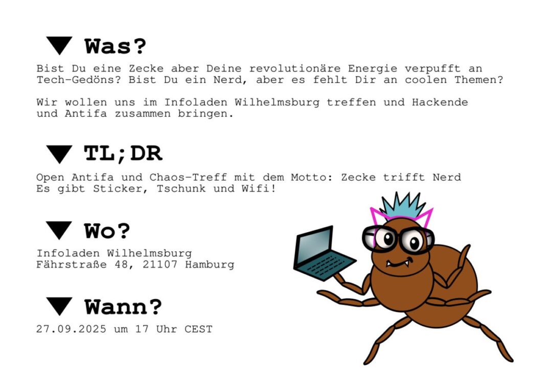 Wir wollen uns im Infoladen Wilhelmsburg treffen und Hackendeund Antifa zusammen bringen. Open Antifa und Chaos-Treff mit dem Motto: Zecke trifft NerdEs gibt Sticker, Tschunk …