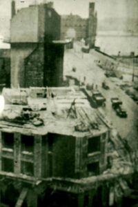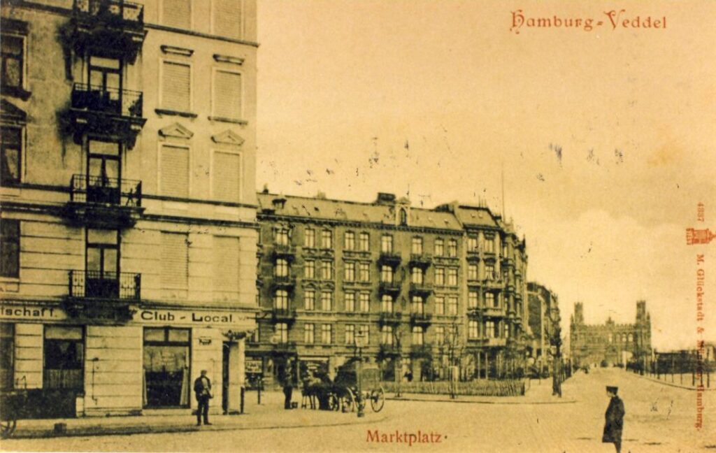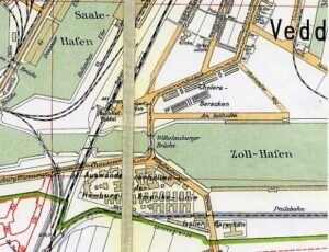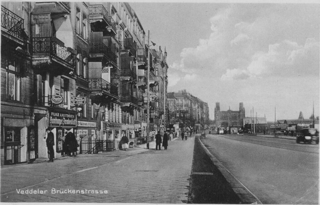 In den folgenden Jahrzehnten wurde die medizinische Versorgung immer mehr ausgebaut […]. Mit Ende des Zweiten Weltkrieges und den verheerenden Bombenangriffen veränderte sich die Veddel grundlegend. Die großen Wohn- und Geschäftshäuser im nördlichen Teil der Veddel waren total zerstört und wurden nicht wieder aufgebaut. Von den neueren Schuhmacher-Bauten waren ebenfalls viele ausgebombt, sie wurden aber sehr rasch wieder aufgebaut. Hier wurden dann die ersten Arztpraxen nach dem Krieg eröffnet. Der Zustand der guten Versorgung, nicht nur im medizinischen Bereich, hielt noch bis in die 60er Jahre an.