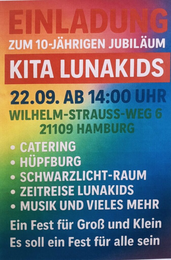 Einladung zum 10-jährigen Jubiläum der KITA Lunakids.