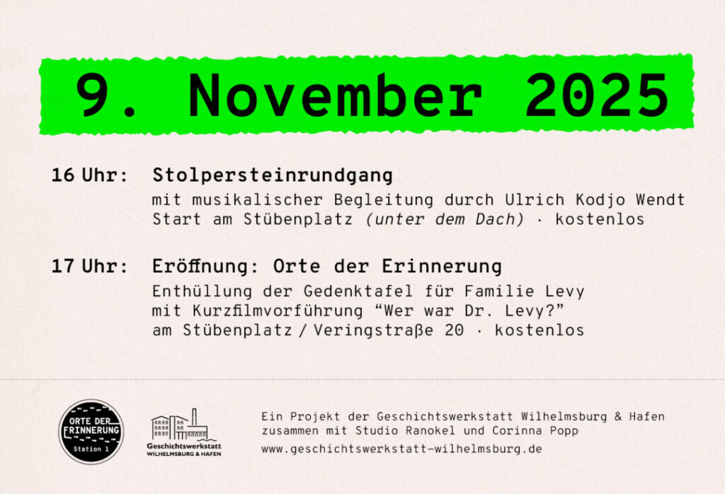 Um 17 Uhr: Ein neuer „Ort der Erinnerung“ – Gedenktafel für Familie Levy – wird enthüllt und der Kurzfilm: „Wer war Dr. Levy?“ gezeigt.