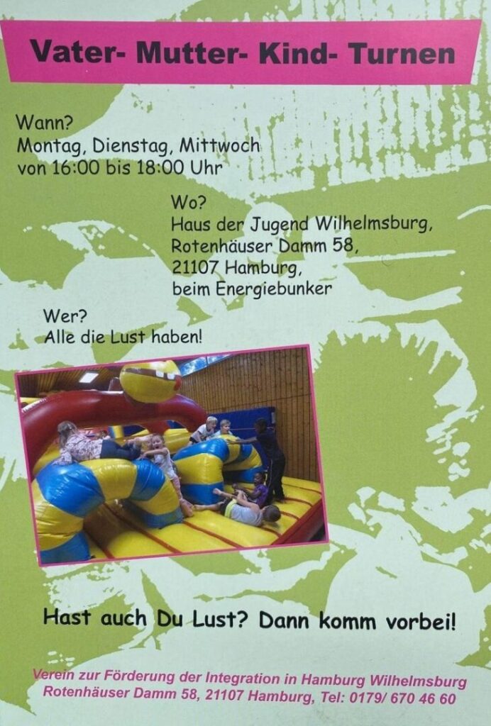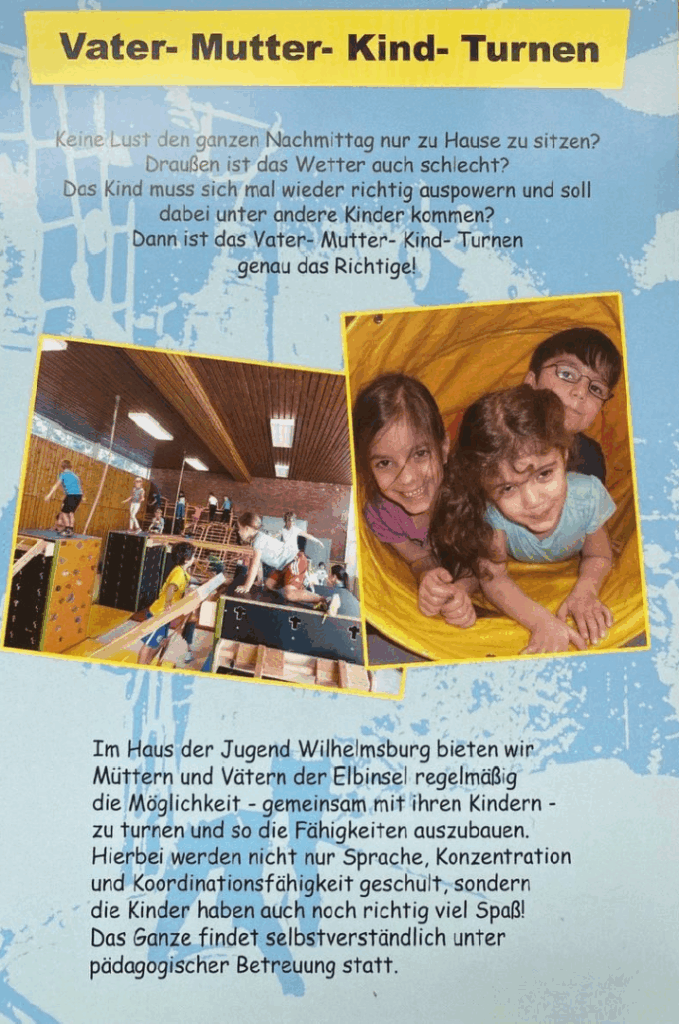 Im Haus der Jugend Wilhelmsburg geben wir Kindern, zusammen mit ihren Eltern die Möglichkeit zum gemeinsamen Turnen.